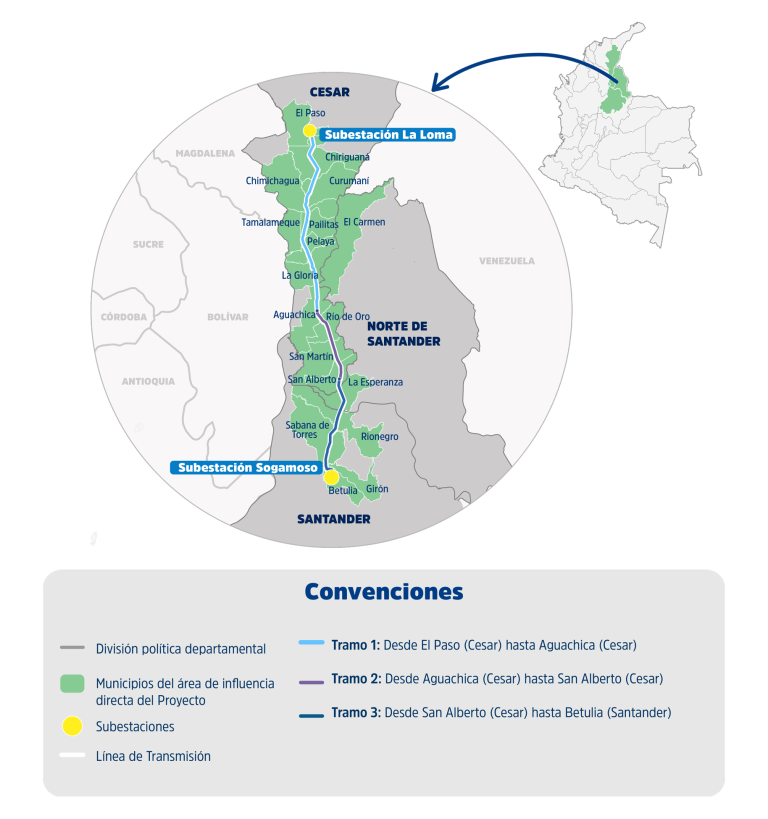 Esta obra, que hace parte de los Proyectos de Interés Nacional y Estratégico (PINE) en Colombia, consiste en la construcción de una línea de transmisión de 500 mil voltios, a doble circuito, que recorrerá aproximadamente 296 kilómetros entre las subestaciones La Loma en Cesar (propiedad del Grupo Energía de Bogotá) y Sogamoso en Santander (propiedad de ISA), y la ampliación de ambas subestaciones.