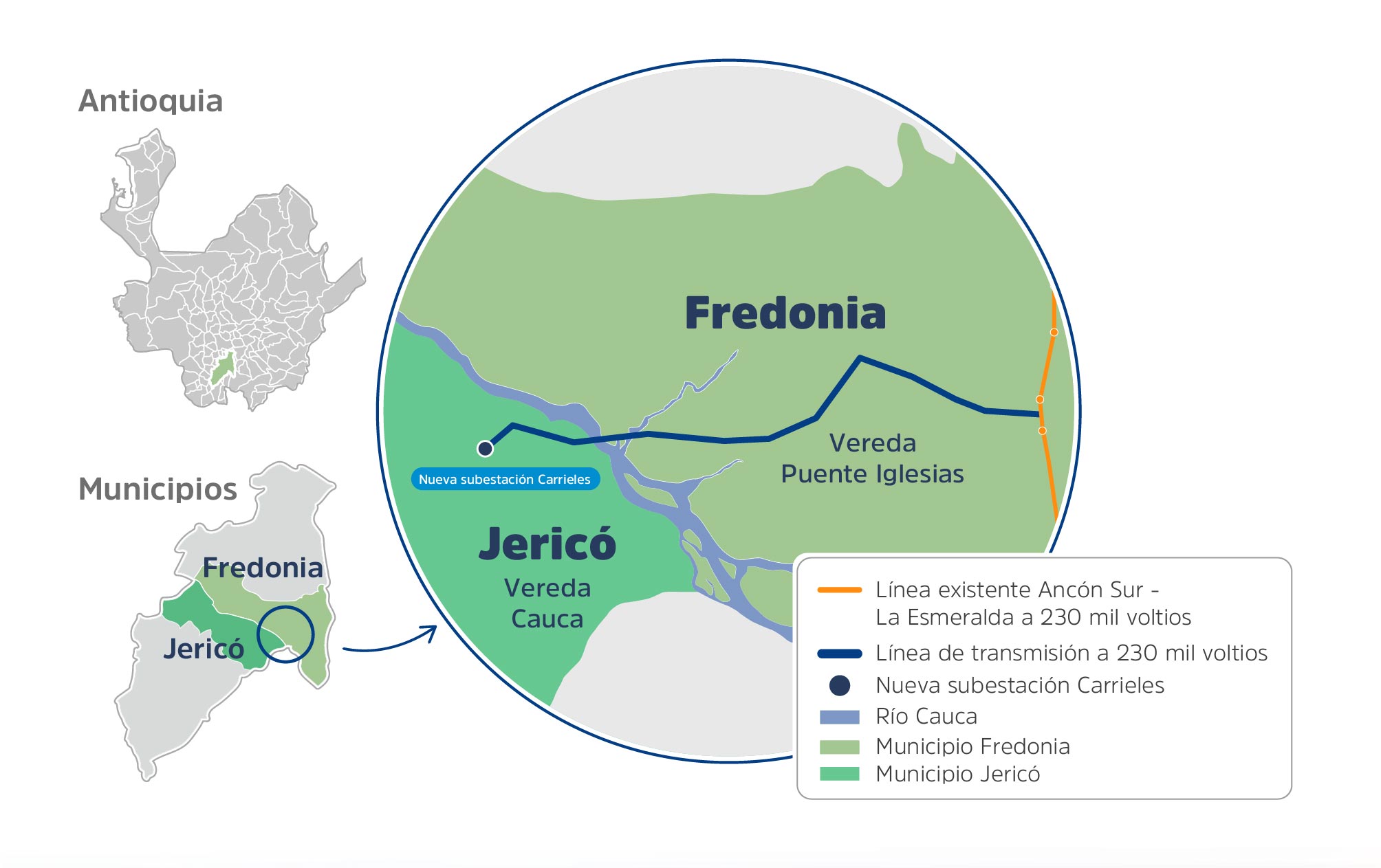 Comprende la construcción de la nueva subestación Carrieles a 230 mil voltios y una línea de doble circuito del mismo voltaje, con una longitud aproximada de 6 kilómetros, que se extienden desde esta nueva subestación hasta el punto de conexión de la línea existente Ancón Sur – La Esmeralda II en el municipio de Fredonia.